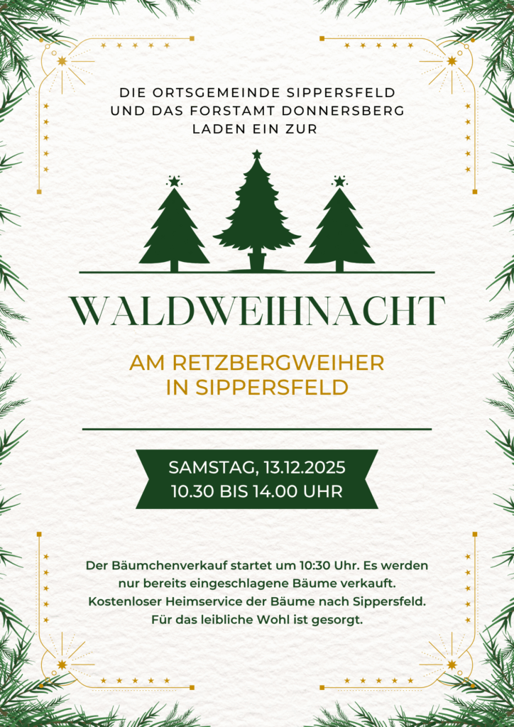 • Waldweihnacht und Bäumchenverkauf am Retzbergweiher Sippersfeld | 13.12.2025 ab 10:30 Uhr